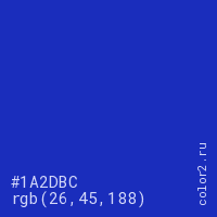 Цвет #1A2DBC в цветовой модели RGB обозначается тремя октетами (26, 45, 188) в десятичном формате и #1A2DBC в шестнадцатиричном (hex) формате, которые являются интенсивностью красного 26 (hex 1A), интенсивность зелёного 45 (hex 2D) и интенсивность синего 188 (hex BC).