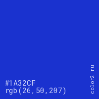 Цвет #1A32CF в цветовой модели RGB обозначается тремя октетами (26, 50, 207) в десятичном формате и #1A32CF в шестнадцатиричном (hex) формате, которые являются интенсивностью красного 26 (hex 1A), интенсивность зелёного 50 (hex 32) и интенсивность синего 207 (hex CF).