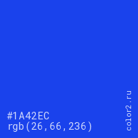 Цвет #1A42EC в цветовой модели RGB обозначается тремя октетами (26, 66, 236) в десятичном формате и #1A42EC в шестнадцатиричном (hex) формате, которые являются интенсивностью красного 26 (hex 1A), интенсивность зелёного 66 (hex 42) и интенсивность синего 236 (hex EC).