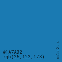 Цвет #1A7AB2 в цветовой модели RGB обозначается тремя октетами (26, 122, 178) в десятичном формате и #1A7AB2 в шестнадцатиричном (hex) формате, которые являются интенсивностью красного 26 (hex 1A), интенсивность зелёного 122 (hex 7A) и интенсивность синего 178 (hex B2).