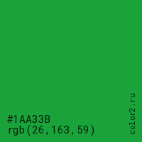 Цвет #1AA33B в цветовой модели RGB обозначается тремя октетами (26, 163, 59) в десятичном формате и #1AA33B в шестнадцатиричном (hex) формате, которые являются интенсивностью красного 26 (hex 1A), интенсивность зелёного 163 (hex A3) и интенсивность синего 59 (hex 3B).