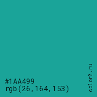 Цвет #1AA499 в цветовой модели RGB обозначается тремя октетами (26, 164, 153) в десятичном формате и #1AA499 в шестнадцатиричном (hex) формате, которые являются интенсивностью красного 26 (hex 1A), интенсивность зелёного 164 (hex A4) и интенсивность синего 153 (hex 99).