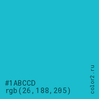 Цвет #1ABCCD в цветовой модели RGB обозначается тремя октетами (26, 188, 205) в десятичном формате и #1ABCCD в шестнадцатиричном (hex) формате, которые являются интенсивностью красного 26 (hex 1A), интенсивность зелёного 188 (hex BC) и интенсивность синего 205 (hex CD).