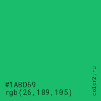 Цвет #1ABD69 в цветовой модели RGB обозначается тремя октетами (26, 189, 105) в десятичном формате и #1ABD69 в шестнадцатиричном (hex) формате, которые являются интенсивностью красного 26 (hex 1A), интенсивность зелёного 189 (hex BD) и интенсивность синего 105 (hex 69).