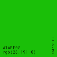 Цвет #1ABF08 в цветовой модели RGB обозначается тремя октетами (26, 191, 8) в десятичном формате и #1ABF08 в шестнадцатиричном (hex) формате, которые являются интенсивностью красного 26 (hex 1A), интенсивность зелёного 191 (hex BF) и интенсивность синего 8 (hex 08).