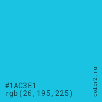 Цвет #1AC3E1 в цветовой модели RGB обозначается тремя октетами (26, 195, 225) в десятичном формате и #1AC3E1 в шестнадцатиричном (hex) формате, которые являются интенсивностью красного 26 (hex 1A), интенсивность зелёного 195 (hex C3) и интенсивность синего 225 (hex E1).