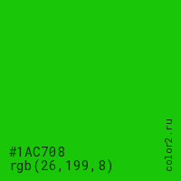 Цвет #1AC708 в цветовой модели RGB обозначается тремя октетами (26, 199, 8) в десятичном формате и #1AC708 в шестнадцатиричном (hex) формате, которые являются интенсивностью красного 26 (hex 1A), интенсивность зелёного 199 (hex C7) и интенсивность синего 8 (hex 08).