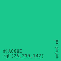 Цвет #1AC88E в цветовой модели RGB обозначается тремя октетами (26, 200, 142) в десятичном формате и #1AC88E в шестнадцатиричном (hex) формате, которые являются интенсивностью красного 26 (hex 1A), интенсивность зелёного 200 (hex C8) и интенсивность синего 142 (hex 8E).
