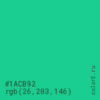 Цвет #1ACB92 в цветовой модели RGB обозначается тремя октетами (26, 203, 146) в десятичном формате и #1ACB92 в шестнадцатиричном (hex) формате, которые являются интенсивностью красного 26 (hex 1A), интенсивность зелёного 203 (hex CB) и интенсивность синего 146 (hex 92).
