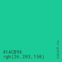 Цвет #1ACB96 в цветовой модели RGB обозначается тремя октетами (26, 203, 150) в десятичном формате и #1ACB96 в шестнадцатиричном (hex) формате, которые являются интенсивностью красного 26 (hex 1A), интенсивность зелёного 203 (hex CB) и интенсивность синего 150 (hex 96).