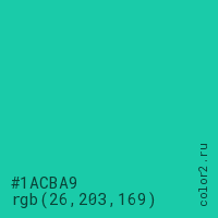 Цвет #1ACBA9 в цветовой модели RGB обозначается тремя октетами (26, 203, 169) в десятичном формате и #1ACBA9 в шестнадцатиричном (hex) формате, которые являются интенсивностью красного 26 (hex 1A), интенсивность зелёного 203 (hex CB) и интенсивность синего 169 (hex A9).
