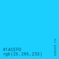 Цвет #1ACEFD в цветовой модели RGB обозначается тремя октетами (26, 206, 253) в десятичном формате и #1ACEFD в шестнадцатиричном (hex) формате, которые являются интенсивностью красного 26 (hex 1A), интенсивность зелёного 206 (hex CE) и интенсивность синего 253 (hex FD).