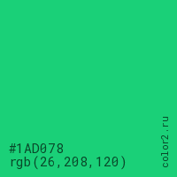 Цвет #1AD078 в цветовой модели RGB обозначается тремя октетами (26, 208, 120) в десятичном формате и #1AD078 в шестнадцатиричном (hex) формате, которые являются интенсивностью красного 26 (hex 1A), интенсивность зелёного 208 (hex D0) и интенсивность синего 120 (hex 78).