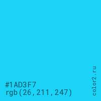 Цвет #1AD3F7 в цветовой модели RGB обозначается тремя октетами (26, 211, 247) в десятичном формате и #1AD3F7 в шестнадцатиричном (hex) формате, которые являются интенсивностью красного 26 (hex 1A), интенсивность зелёного 211 (hex D3) и интенсивность синего 247 (hex F7).