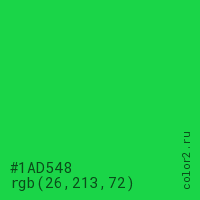 Цвет #1AD548 в цветовой модели RGB обозначается тремя октетами (26, 213, 72) в десятичном формате и #1AD548 в шестнадцатиричном (hex) формате, которые являются интенсивностью красного 26 (hex 1A), интенсивность зелёного 213 (hex D5) и интенсивность синего 72 (hex 48).
