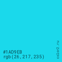Цвет #1AD9EB в цветовой модели RGB обозначается тремя октетами (26, 217, 235) в десятичном формате и #1AD9EB в шестнадцатиричном (hex) формате, которые являются интенсивностью красного 26 (hex 1A), интенсивность зелёного 217 (hex D9) и интенсивность синего 235 (hex EB).