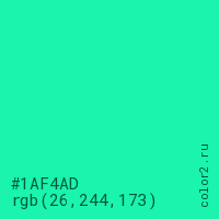 Цвет #1AF4AD в цветовой модели RGB обозначается тремя октетами (26, 244, 173) в десятичном формате и #1AF4AD в шестнадцатиричном (hex) формате, которые являются интенсивностью красного 26 (hex 1A), интенсивность зелёного 244 (hex F4) и интенсивность синего 173 (hex AD).
