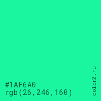 Цвет #1AF6A0 в цветовой модели RGB обозначается тремя октетами (26, 246, 160) в десятичном формате и #1AF6A0 в шестнадцатиричном (hex) формате, которые являются интенсивностью красного 26 (hex 1A), интенсивность зелёного 246 (hex F6) и интенсивность синего 160 (hex A0).