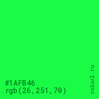 Цвет #1AFB46 в цветовой модели RGB обозначается тремя октетами (26, 251, 70) в десятичном формате и #1AFB46 в шестнадцатиричном (hex) формате, которые являются интенсивностью красного 26 (hex 1A), интенсивность зелёного 251 (hex FB) и интенсивность синего 70 (hex 46).