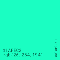 Цвет #1AFEC2 в цветовой модели RGB обозначается тремя октетами (26, 254, 194) в десятичном формате и #1AFEC2 в шестнадцатиричном (hex) формате, которые являются интенсивностью красного 26 (hex 1A), интенсивность зелёного 254 (hex FE) и интенсивность синего 194 (hex C2).