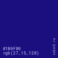 Цвет #1B0F80 в цветовой модели RGB обозначается тремя октетами (27, 15, 128) в десятичном формате и #1B0F80 в шестнадцатиричном (hex) формате, которые являются интенсивностью красного 27 (hex 1B), интенсивность зелёного 15 (hex 0F) и интенсивность синего 128 (hex 80).
