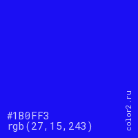 Цвет #1B0FF3 в цветовой модели RGB обозначается тремя октетами (27, 15, 243) в десятичном формате и #1B0FF3 в шестнадцатиричном (hex) формате, которые являются интенсивностью красного 27 (hex 1B), интенсивность зелёного 15 (hex 0F) и интенсивность синего 243 (hex F3).