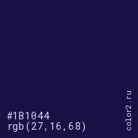 Цвет #1B1044 в цветовой модели RGB обозначается тремя октетами (27, 16, 68) в десятичном формате и #1B1044 в шестнадцатиричном (hex) формате, которые являются интенсивностью красного 27 (hex 1B), интенсивность зелёного 16 (hex 10) и интенсивность синего 68 (hex 44).