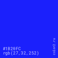 Цвет #1B20FC в цветовой модели RGB обозначается тремя октетами (27, 32, 252) в десятичном формате и #1B20FC в шестнадцатиричном (hex) формате, которые являются интенсивностью красного 27 (hex 1B), интенсивность зелёного 32 (hex 20) и интенсивность синего 252 (hex FC).