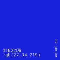 Цвет #1B22DB в цветовой модели RGB обозначается тремя октетами (27, 34, 219) в десятичном формате и #1B22DB в шестнадцатиричном (hex) формате, которые являются интенсивностью красного 27 (hex 1B), интенсивность зелёного 34 (hex 22) и интенсивность синего 219 (hex DB).