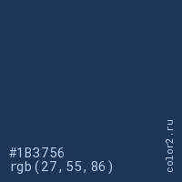 Цвет #1B3756 в цветовой модели RGB обозначается тремя октетами (27, 55, 86) в десятичном формате и #1B3756 в шестнадцатиричном (hex) формате, которые являются интенсивностью красного 27 (hex 1B), интенсивность зелёного 55 (hex 37) и интенсивность синего 86 (hex 56).