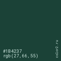 Цвет #1B4237 в цветовой модели RGB обозначается тремя октетами (27, 66, 55) в десятичном формате и #1B4237 в шестнадцатиричном (hex) формате, которые являются интенсивностью красного 27 (hex 1B), интенсивность зелёного 66 (hex 42) и интенсивность синего 55 (hex 37).