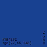 Цвет #1B4292 в цветовой модели RGB обозначается тремя октетами (27, 66, 146) в десятичном формате и #1B4292 в шестнадцатиричном (hex) формате, которые являются интенсивностью красного 27 (hex 1B), интенсивность зелёного 66 (hex 42) и интенсивность синего 146 (hex 92).