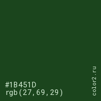 Цвет #1B451D в цветовой модели RGB обозначается тремя октетами (27, 69, 29) в десятичном формате и #1B451D в шестнадцатиричном (hex) формате, которые являются интенсивностью красного 27 (hex 1B), интенсивность зелёного 69 (hex 45) и интенсивность синего 29 (hex 1D).