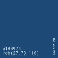Цвет #1B4974 в цветовой модели RGB обозначается тремя октетами (27, 73, 116) в десятичном формате и #1B4974 в шестнадцатиричном (hex) формате, которые являются интенсивностью красного 27 (hex 1B), интенсивность зелёного 73 (hex 49) и интенсивность синего 116 (hex 74).