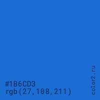 Цвет #1B6CD3 в цветовой модели RGB обозначается тремя октетами (27, 108, 211) в десятичном формате и #1B6CD3 в шестнадцатиричном (hex) формате, которые являются интенсивностью красного 27 (hex 1B), интенсивность зелёного 108 (hex 6C) и интенсивность синего 211 (hex D3).