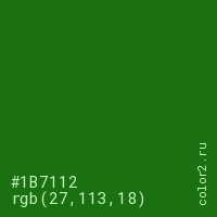 Цвет #1B7112 в цветовой модели RGB обозначается тремя октетами (27, 113, 18) в десятичном формате и #1B7112 в шестнадцатиричном (hex) формате, которые являются интенсивностью красного 27 (hex 1B), интенсивность зелёного 113 (hex 71) и интенсивность синего 18 (hex 12).