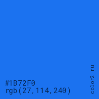 Цвет #1B72F0 в цветовой модели RGB обозначается тремя октетами (27, 114, 240) в десятичном формате и #1B72F0 в шестнадцатиричном (hex) формате, которые являются интенсивностью красного 27 (hex 1B), интенсивность зелёного 114 (hex 72) и интенсивность синего 240 (hex F0).