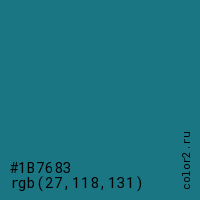 Цвет #1B7683 в цветовой модели RGB обозначается тремя октетами (27, 118, 131) в десятичном формате и #1B7683 в шестнадцатиричном (hex) формате, которые являются интенсивностью красного 27 (hex 1B), интенсивность зелёного 118 (hex 76) и интенсивность синего 131 (hex 83).