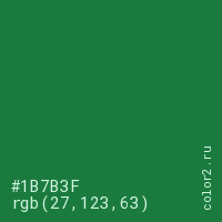 Цвет #1B7B3F в цветовой модели RGB обозначается тремя октетами (27, 123, 63) в десятичном формате и #1B7B3F в шестнадцатиричном (hex) формате, которые являются интенсивностью красного 27 (hex 1B), интенсивность зелёного 123 (hex 7B) и интенсивность синего 63 (hex 3F).