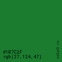 Цвет #1B7C2F в цветовой модели RGB обозначается тремя октетами (27, 124, 47) в десятичном формате и #1B7C2F в шестнадцатиричном (hex) формате, которые являются интенсивностью красного 27 (hex 1B), интенсивность зелёного 124 (hex 7C) и интенсивность синего 47 (hex 2F).