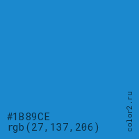 Цвет #1B89CE в цветовой модели RGB обозначается тремя октетами (27, 137, 206) в десятичном формате и #1B89CE в шестнадцатиричном (hex) формате, которые являются интенсивностью красного 27 (hex 1B), интенсивность зелёного 137 (hex 89) и интенсивность синего 206 (hex CE).