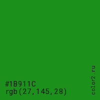Цвет #1B911C в цветовой модели RGB обозначается тремя октетами (27, 145, 28) в десятичном формате и #1B911C в шестнадцатиричном (hex) формате, которые являются интенсивностью красного 27 (hex 1B), интенсивность зелёного 145 (hex 91) и интенсивность синего 28 (hex 1C).