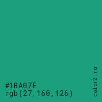 Цвет #1BA07E в цветовой модели RGB обозначается тремя октетами (27, 160, 126) в десятичном формате и #1BA07E в шестнадцатиричном (hex) формате, которые являются интенсивностью красного 27 (hex 1B), интенсивность зелёного 160 (hex A0) и интенсивность синего 126 (hex 7E).