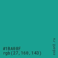 Цвет #1BA08F в цветовой модели RGB обозначается тремя октетами (27, 160, 143) в десятичном формате и #1BA08F в шестнадцатиричном (hex) формате, которые являются интенсивностью красного 27 (hex 1B), интенсивность зелёного 160 (hex A0) и интенсивность синего 143 (hex 8F).
