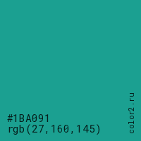 Цвет #1BA091 в цветовой модели RGB обозначается тремя октетами (27, 160, 145) в десятичном формате и #1BA091 в шестнадцатиричном (hex) формате, которые являются интенсивностью красного 27 (hex 1B), интенсивность зелёного 160 (hex A0) и интенсивность синего 145 (hex 91).