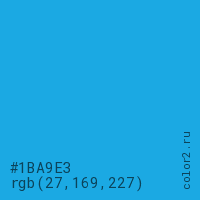 Цвет #1BA9E3 в цветовой модели RGB обозначается тремя октетами (27, 169, 227) в десятичном формате и #1BA9E3 в шестнадцатиричном (hex) формате, которые являются интенсивностью красного 27 (hex 1B), интенсивность зелёного 169 (hex A9) и интенсивность синего 227 (hex E3).