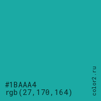 Цвет #1BAAA4 в цветовой модели RGB обозначается тремя октетами (27, 170, 164) в десятичном формате и #1BAAA4 в шестнадцатиричном (hex) формате, которые являются интенсивностью красного 27 (hex 1B), интенсивность зелёного 170 (hex AA) и интенсивность синего 164 (hex A4).