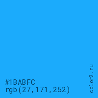 Цвет #1BABFC в цветовой модели RGB обозначается тремя октетами (27, 171, 252) в десятичном формате и #1BABFC в шестнадцатиричном (hex) формате, которые являются интенсивностью красного 27 (hex 1B), интенсивность зелёного 171 (hex AB) и интенсивность синего 252 (hex FC).