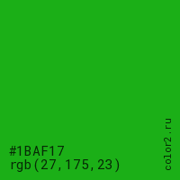 Цвет #1BAF17 в цветовой модели RGB обозначается тремя октетами (27, 175, 23) в десятичном формате и #1BAF17 в шестнадцатиричном (hex) формате, которые являются интенсивностью красного 27 (hex 1B), интенсивность зелёного 175 (hex AF) и интенсивность синего 23 (hex 17).