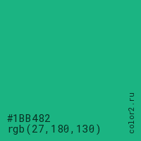 Цвет #1BB482 в цветовой модели RGB обозначается тремя октетами (27, 180, 130) в десятичном формате и #1BB482 в шестнадцатиричном (hex) формате, которые являются интенсивностью красного 27 (hex 1B), интенсивность зелёного 180 (hex B4) и интенсивность синего 130 (hex 82).